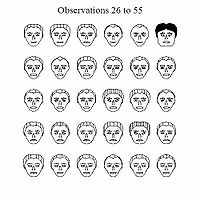 Chernoff- oder Flury-Gesichter. Die Gesichtsmerkmale repräsentieren die nationalen Rekorde in verschiedenen Laufdisziplinen. Jedes Gesicht entspricht einem Land. -