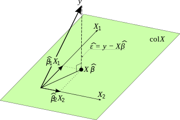 {\displaystyle {\hat {\mathbf {y} }}=\mathbf {X} \mathbf {b} =\mathbf {y} -{\hat {\boldsymbol {\varepsilon }}}},