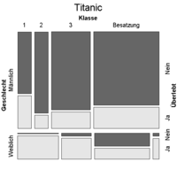 Mosaikplot der Häufigkeiten der Passagiere der Titanic nach den Variablen Klasse (1. Klasse, 2. Klasse, 3. Klasse, Besatzung), Geschlecht (männlich, weiblich) und Überlebt (ja, nein).