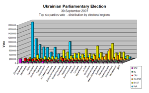 3D Balkendiagramm des Ergebnisses der Parlamentswahlen in der Ukraine am 30. September 2007 aufgeteilt nach Regionen und Parteien. -