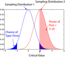 In der zweiten Abbildung ist, zusammengesetzt aus zwei blauen Teilflächen, die Fehlerwahrscheinlichkeit 1. Art, d. h. die Ablehnwahrscheinlichkeit bei Richtigkeit der Nullhypothese, für den Fall einer zweiseitigen Alternativhypothese dargestellt. Die rot schraffierte Fläche unter der roten Dichtefunktion über dem Ablehnbereich verdeutlicht eine Fehlerwahrscheinlichkeit 2. Art und damit einen Wert der Trennschärfe (Power) des Tests. Ein zweiter, in diesem Fall sehr kleiner, Teil der Fehlerwahrscheinlichkeit 2. Art wird durch die Fläche unter der roten Dichtefunktion über dem linken Teil des Ablehnbereichs beigetragen, ist aber in dieser Graphik nicht sichtbar. Häufig, wie auch in den beiden angegebenen Beispielen von Ablehnbereichen, kann im Fall einer einfachen Nullhypothese der Ablehnbereich so gewählt werden, dass die Fehlerwahrscheinlichkeit 1. Art und das vorgegebene Signifikanzvniveau übereinstimmen.
