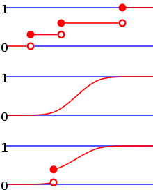 Verteilungsfunktionen von diskreten Wahrscheinlichkeitsverteilungen zeichnen sich durch ihre Sprünge zwischen den Bereichen mit konstanten Funktionswerten aus. Bei ihnen handelt es sich um Sprungfunktionen.
