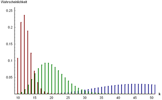 Wahrscheinlichkeitsverteilung ![]() Erwartungswert=10 orange; grün die Standardabweichung | |