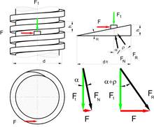 Zwischen Schraube und Mutter wirkt an der Kontaktfläche der Gewindegänge eine Normalkraft. Diese kann in eine Tangentialkomponente und eine Komponente in Längsrichtung der Schraube zerlegt werden. Die Tangentialkomponente sorgt für das Momentengleichgewicht um die Achse der Schraube. Die Zugkraft spannt die Verbindung. Durch die Steigung der Schraube wird so eine geringere Kraft in tangentialer Richtung in eine größere Kraft in Längsrichtung gewandelt.