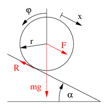 Die auf das Rad hangabwärts wirkende Komponente F der Gewichtskraft mg hat die Größe F=mgsin(α). Ihr entgegen steht die Reibkraft, sodass nach dem zweiten newtonschen Gesetz gilt: