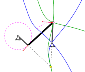 Bei viergliedrigen Gelenkgetrieben wie z. B. Doppelkurbeln lässt sich die Gangpolbahn der rechts im Bild schwarz dargestellten Koppel besonders einfach punktweise ermitteln, da die Bahn der Gelenke der Koppel jeweils einen Kreisbogen mit dem Gestellgelenk als Mittelpunkt bilden (vergleiche Bild ganz oben) und somit die Normalen mit der Richtung der grauen Kurbeln bzw. Schwingen identisch sind. Bei viergliedrigen Gelenkgetrieben liegen die Momentanpole demnach immer im Schnittpunkt der grauen Kurbeln oder Schwingen bzw. im Schnittpunkt deren violetten Verlängerungen.