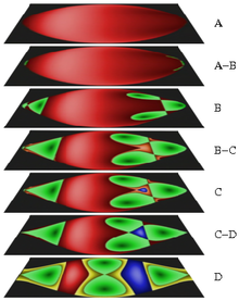 Zwischen D und C findet eine Bifurkation der Energiefläche statt und der gelbe Bereich verschwindet. Zwischen C und B verschwindet blau in einer Tangenten-Bifurkation. Zwischen B und A verschwindet grün in einer Pitchfork-Bifurkation.