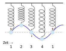 Aufgrund der Trägheit bewegt sich der Oszillator jedoch weiter. Dies führt dazu, dass die Feder, diesmal in anderer Richtung, wieder gespannt wird. Für das Spannen dieser Feder muss der Oszillator seine kinetische Energie aufwenden, um sich gegen die Kraft der Feder bewegen zu können. Er wird dadurch langsamer, bis er den Punkt erreicht, an dem er sich nicht mehr bewegt und die gesamte Energie wieder in Form von potentieller Energie vorliegt. Der Bewegungsablauf beginnt dann wieder von vorne.