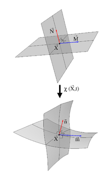materielle Linien des Körpers vor und nach Deformation miteinander verglichen.
