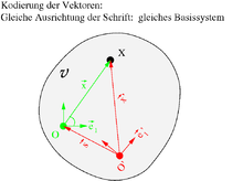 {\mathcal  {V}}(O',X)={\mathcal  {V}}(O',O)+{\mathcal  {V}}(O,X)\Leftrightarrow \sum _{{i=1}}^{3}x'_{i}{\vec  {e}}'_{i}=\sum _{{i=1}}^{3}s_{i}{\vec  {e}}'_{i}+\sum _{{j=1}}^{3}x_{j}{\vec  {e}}_{j}=\sum _{{i=1}}^{3}s_{i}{\vec  {e}}'_{i}+\sum _{{i,j=1}}^{3}x_{j}({\vec  {e}}'_{i}\cdot {\vec  {e}}_{j}){\vec  {e}}'_{i}\,.