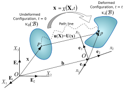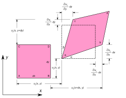 Als Verformung (auch Deformation oder Verzerrung bezeichnet) eines Körpers bezeichnet man in der Kontinuumsmechanik die Änderung seiner Form infolge der Einwirkung einer äußeren Kraft bzw. mechanischer Spannung. Die Deformation kann als Längenänderung (Dehnung) oder als Winkel­änderung (Scherung) in Erscheinung treten. Eine Verformung kann mithilfe von Verschiebungsgradient, dem komplexeren Deformationsgradient sowie dem resultierenden Verzerrungstensors dargestellt werden.