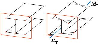 Hinweis: Entgegen dem optischen Eindruck stehen rechts die Flächen des Ober- und Untergurts des I-Profils nicht in einem Winkel zueinander. Lediglich die Eckpunkte verschieben sich. In der Realität würden Ober-, Untergurt und Steg bei Verwindung des Profils in eine spiralförmige Form gezwungen, was hier jedoch nicht dargestellt ist.