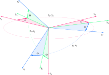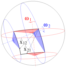 Winkelgeschwindigkeiten am Ort siehe Winkelgeschwindigkeitstensor und Winkelgeschwindigkeit. Weil die Addition von Tensoren kommutativ ist, stimmen die Geschwindigkeiten überein: |