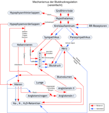 Hier ist insbesondere das Renin-Angiotensin-Aldosteron-System zu nennen. Sinkt die Nierendurchblutung ab (z.B. durch einen generalisierten arteriellen Druckabfall oder eine Nierenarterienverengung), führt dies zu erhöhter Reninfreisetzung in der Niere und damit letztlich zu einer Konzentrationserhöhung von Angiotensin II, das sofort gefäßverengend wirkt und langfristig das Blutvolumen erhöht, was über den Frank-Starling-Mechanismus ebenfalls den arteriellen Blutdruck erhöht. Die Reninfreisetzung wird außerdem durch den Sympathikus gesteigert, dessen Aktivität von den Signalen der oben genannten Rezeptoren (insbesondere auch der aus dem Niederdrucksystem) abhängt.