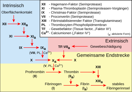 | XIII | Fibrinstabilisierender Faktor | XIIIa wandelt Fibrinmonomere in vernetztes Fibrin um. | Faktor-XIII-Mangel |