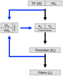 Der normale physiologische Ablauf[9] (extrinsisches System oder exogener Mechanismus) wird durch Kontakt von Blut mit Gewebethromboplastin aus verletztem subendothelialen Gewebe initiiert. Gewebefaktor (auch Tissue Factor (TF), Gewebethromboplastin oder Faktor III) ist ein Membranprotein, welches beispielsweise in der Adventitia von Blutgefäßen vorkommt – von Endothelzellen wird es nur nach Aktivierung freigesetzt. Es bildet einen Komplex mit Faktor VII, der in seine aktive Form überführt wird. Dadurch wird etwas Thrombin gebildet, der Prozess wird aber relativ schnell durch den TFPI (Tissue Factor Pathway Inhibitor) gehemmt. Wenn genug Thrombin gebildet wurde, wird ein sogenannter Aktivatorkomplex der Faktoren IX und VIII aktiviert (siehe IXa und VIIIa in Abbildung). Dieser Komplex aktiviert wiederum Faktor X.