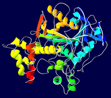Bändermodell des Monomers der AChE vom Menschen im Komplex mit Fasciculin (ein Schlangentoxin), nach PDB
