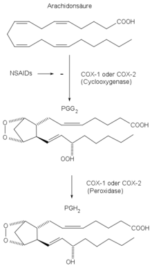 - Acetylsalicylsäure (Aspirin) führt zu einer Transacetylierung am Serin in Position 530 im katalytischen Zentrum der Cyclooxygenase, die das Enzym funktionsunfähig macht, bis es wieder neu gebildet wird. Die Cyclooxygenase-1 ist hierfür 10–100 mal sensitiver als die Cyclooxygenase-2.