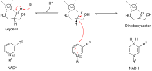 Glycerin wird durch die Glycerin-Dehydrogenase oxidiert und dehydriert. Neben dem Reduktionsäquivalent NADH entsteht hierbei Dihydroxyaceton.