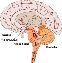 Serotonin, das sich im Zentralnervensystem in den Zellkörpern, den Somata serotoninerger Nervenbahnen in den Raphe-Kernen befindet, deren Axone in alle Teile des Gehirns ausstrahlen, beeinflusst unmittelbar oder mittelbar fast alle Gehirnfunktionen. Zu den wichtigsten Funktionen des Serotonins im Gehirn, das die Blut-Hirn-Schranke nicht überwinden kann und daher vor Ort gebildet werden muss, zählen die Steuerung oder Beeinflussung der Wahrnehmung, des Schlafs, der Temperaturregulation, der Sensorik, der Schmerzempfindung und Schmerzverarbeitung, des Appetits, des Sexualverhaltens und der Hormonsekretion. Serotonin fungiert dabei einerseits als Neurotransmitter im synaptischen Spalt, andererseits wird es diffus über freie Nervenendungen ausgeschüttet und wirkt als Neuromodulator.
