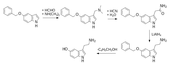 Gemäß einer fast zeitgleichen Veröffentlichung von Merrill E. Speeter und Mitarbeitern wird zunächst 3-(5-Benzyloxy)indolyl-magnesiumiodid als Grignard-Reagenz hergestellt und dann mit Chloracetonitril zum entsprechenden 3-Acetonitrilindol umgesetzt. Das Nitril wird reduziert und der Ether gespalten. Eine mit den vorstehenden Verfahren verwandte Variante mit verbesserten Ausbeuten beschreibt die Herstellung von radioaktiv markiertem [11C]-Serotonin für Positronen-Emissions-Tomographieuntersuchungen. Dabei wird 5-Methoxygramin an N2 zur quartären Ammoniumverbindung umgesetzt und mit [11C]-Cyanwasserstoff zu 5-Methoxy-3-acetonitrilindol nukleophil substituiert. Es folgt eine Etherspaltung und schließlich eine Reduktion. Eine Methode, die sich auf zwei Reaktionsschritte beschränkt, besteht in der Addition von Nitroethylen an 5-Benzyloxyindol mit nachfolgender Hydrierung. Das Nitrovinylindol, das als Zwischenprodukt auftritt, ist alternativ über eine Aldolkondensation des Indol-3-carbaldehyds mit Nitromethan zugänglich. Ferner existiert noch der probate Weg über die Friedel-Crafts-Acylierung mit Oxalylchlorid. Das auf solche Weise gewonnene 5-Benzyloxy-3-Indol-glyoxylylchlorid verbindet sich mit Dibenzylamin zum Amid, das reduziert und debenzyliert wird.
