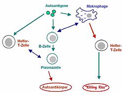 Genomweite Assoziationsstudien haben für viele Autoimmunkrankheiten gezeigt, dass sie gehäuft bei Vorliegen bestimmter Genvarianten auftreten. Die betroffenen Gene kodieren regelmäßig für Rezeptoren von Entzündungsmediatoren und Proteine der intrazellulären Signalverarbeitung, besonders häufig aber für MHC-Moleküle in für die Krankheit charakteristischen Allelen: T-Zellen erkennen anders als B-Zellen nicht direkt Strukturen potentieller Eindringlinge, sondern nur Peptide (kurze Aminosäuresequenzen), die ihnen von anderen Zellen auf bestimmten Membranproteinen, ebenjenen MHC-Molekülen, präsentiert werden. Alle Körperzellen bauen ständig einen Teil ihrer Proteine ab, um Fragmente daraus auf MHC-Molekülen der Klasse 1 zu präsentieren; so ist gewährleistet, dass auch intrazelluläre Erreger sich nicht vor dem Immunsystem verstecken können. Professionell antigenpräsentierende Zellen (Makrophagen, dendritische Zellen und B-Zellen) fressen (phagozytieren) verdächtige Zellen und Zelltrümmer und präsentieren bei der Verdauung entstehenden Peptide über MHC-Moleküle der Klasse 2.