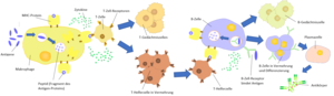 Eine aktivierte T-Helferzelle nimmt Kontakt mit einem B-Lymphozyten auf, der mit Hilfe seines Immunglobulinrezeptors dasselbe Antigen (B-Epitop) erkannt hat und nun seinerseits das T-Epitop über MHC-Klasse-2 auf seiner Oberfläche präsentiert, und aktiviert diesen durch die Ausschüttung von Zytokinen. Der aktivierte B-Lymphozyt bildet B-Plasmazellen und B-Gedächtniszellen aus. Die B-Gedächtniszellen sind langlebig und sorgen bei einem sekundären Kontakt mit dem Antigen für eine schnellere und wirksamere Immunantwort. Die B-Plasmazellen produzieren Antikörper, die das Pathogen unschädlich machen. Die Produktion dieser Antikörper findet im rauen Endoplasmatischen Retikulum (ER) statt. Dort wird eine Art „Grundform“ an den Ribosomen translatiert, welche sich erst durch den Einsatz von spezifischen Enzymen, die die variablen Epitope nach Vorlage (die Epitope der Antigene) zurechtschneiden, an die Epitope der Antigene binden kann.