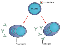 Eine B-Zelle wird nach Antigenkontakt zur Plasmazelle, die spezifische Antikörper produziert