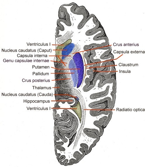 Horizontalschnitt durch das Telencephalon. Basalganglien blau.