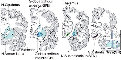 Die Eingangsstation in die Basalganglien stellt das Striatum dar. Es erhält nicht nur Projektionen aus der Großhirnrinde und der Substantia nigra, sondern noch aus den verschiedensten Kerngebieten des Zentralnervensystems, z. B. Raphe-Kerne, Formatio reticularis. Den Ausgangspunkt bildet das Pallidum internum (GPI), welches direkt GABAerg (hemmend) auf den Thalamus projiziert und ihn (und somit auch die Großhirnrinde) hemmt. Sowohl Pallidum als auch Nucleus subthalamicus gehören entwicklungsgeschichtlich zum Thalamus ventralis.