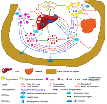 Über die Nahrung zugeführtes Cholesterin sowie Triglyceride werden vom Intestinaltrakt aufgenommen und dann in Form von Chylomikronen auf dem Lymphweg über den Ductus thoracicus in venöses Blut abgegeben. Die nach Einwirkung von Lipasen und Abgabe der freigesetzten Fettsäuren in den peripheren Muskel- und Fettzellen verbleibenden so genannten Chylomikronen-Remnants (engl. Überbleibsel) werden schließlich von der Leber aufgenommen und zerlegt.