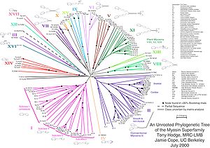 Nach phylogenetischen Studien (vgl. Homologie (Biologie)) unterteilt man die Familie der Myosine in Klassen und Subklassen. In Muskelfasern vorkommendes Myosin gehört mit einigen anderen Nicht-Muskel Myosinen zu Klasse II, welche auch als konventionelle Myosine bezeichnet werden. Alle anderen Klassen werden als unkonventionelle Myosine bezeichnet. Die zuerst entdeckten unkonventionellen Myosine wurden in Klasse I zusammengefasst. Neuere Klassen unkonventioneller Myosine werden fortlaufend nummeriert (III, IV, V …). Offiziell wurden 18 Klassen unkonventioneller Myosine benannt, wobei inzwischen mindestens sechs weitere, noch nicht benannte Klassen bekannt sind. Einige Abgrenzungen und Zuordnungen sind aber fraglich.