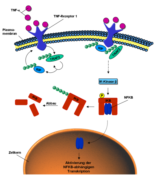 Ubiquitin ist auch an der intrazellulären Signal-Weiterleitung von äußeren Stimuli beteiligt, so zum Beispiel beim NF-κB-Signalweg (engl. nuclear factor kappa B).[26] Dieser kann durch das Signalmolekül Tumornekrosefaktor (TNF) aktiviert werden. Bindet TNF an den TNF-Rezeptor der Zellmembran, wird durch dessen Konformationsänderung die E3-Ligase TRAF2 an den intrazellulären Teil des Rezeptors rekrutiert. Diese poly-ubiquitiniert sich selbst und das Protein RIP über K63-Verbindungen.[27] Durch die ubiquitinierten Proteine RIP und TRAF2 werden verschiedene Kinasen, phosphorylierende Enzyme, aktiviert. Die Iκ-Kinase β letztendlich phosphoryliert das Protein IκB. Dieses setzt nun den vorher gebundenen und inaktiven NF-κB frei. NF-κB wandert in den Zellkern und aktiviert dort die Transkription bestimmter Gene.[28] IkB hingegen wird über K48 poly-ubiquitiniert und über das Proteasom abgebaut.[29]