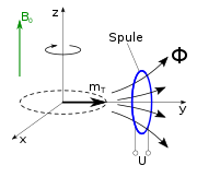 Einige Atomkerne (wie etwa die Wasserstoffkerne) in den Molekülen des zu untersuchenden Gewebes besitzen einen Eigendrehimpuls (Kernspin) und sind dadurch magnetisch. Diese Kerne erzeugen nach dem Anlegen eines starken statischen Magnetfeldes eine kleine longitudinale Magnetisierung in Richtung des statischen Feldes (Paramagnetismus). Durch ein kurzzeitig angelegtes zusätzliches hochfrequentes Wechselfeld im Radiofrequenzbereich lässt sich diese Magnetisierung aus der Richtung des statischen Feldes auslenken (kippen), also teilweise oder ganz (Sättigung) in eine transversale Magnetisierung umwandeln. Die transversale Magnetisierung beginnt sofort um die Feldrichtung des statischen Magnetfeldes zu präzedieren, d. h. die Magnetisierungsrichtung rotiert (siehe Abbildung zur Präzession). Diese Präzessionsbewegung der Gewebemagnetisierung induziert wie die Rotation des Magneten im Dynamo in einer Spule (Empfängerstromkreis) eine elektrische Spannung und kann damit nachgewiesen werden. Ihre Amplitude ist proportional zur transversalen Magnetisierung.