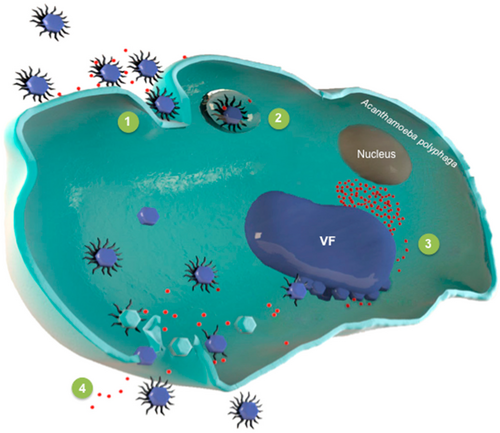 Bei den Virophagen der Familie Lavidaviridae wird angenommen, dass die Replikation der Virophagen vollständig in der Virusfabrik des Riesenvirus-Wirts stattfindet und daher vom Expressions- und Replikationskomplex des Riesenvirus abhängt.[6] Wenn die Wirtszelle nur vom Riesenvirus infiziert wird, baut dieses im Zytoplasma eine Virusfabrik (VF) auf, um sich zu replizieren und neue Virionen zu erzeugen. Die Wirtszelle wird am Ende seines Replikationszyklus gewöhnlich lysiert, d. h. unter Freisetzung der Virus-Nachkommenschaft zum Platzen gebracht und so zerstört.[6]