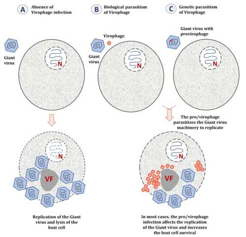 Wenn die Wirtszelle mit einem Riesenvirus und einem Virophagen koinfiziert ist, parasitiert letzterer in der Virusfabrik des Riesenvirus. Die Anwesenheit von Virophagen kann die Infektiosität des Riesenvirus daher ernsthaft beeinträchtigen, indem sie seine Replikationseffizienz verringert und damit indirekt das Überleben der Wirtszelle erhöht.[6]
