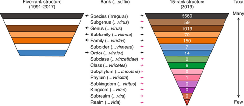 Die taxonomische Struktur war bis 2017 im Prinzip wie bei der herkömmlichen Virusklassifikation ab Stufe Ordnung und darunter (siehe oben) und wurde 2018 durch weitere Stufen wie folgt ergänzt (mit vom LHC-System abweichenden Namensendungen). Oberste Rangstufe ist jetzt Realm[5] (en. realm, anstelle der Domäne bei zellulären Organismen):[6][7]