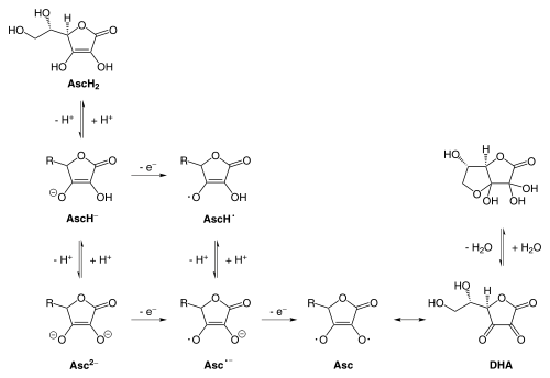 Ascorbinsäure ist in wässrigen Lösungen ein starkes Reduktionsmittel. Hierbei kann es über Zwischenstufen zu Dehydroascorbinsäure (DHA) oxidiert werden (vgl. obere Abbildung). Dieser Prozess ist auch reversibel, so können beispielsweise Cystein, Dithiothreitol oder andere Thiole DHA zurück zu Ascorbinsäure reduzieren.