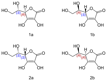 Ascorbinsäure hat zwei asymmetrische Kohlenstoffatome (C4 und C5) und existiert damit in vier verschiedenen stereoisomeren Formen, die optische Aktivität aufweisen: