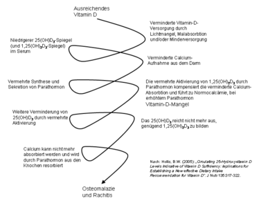 Vitamin D spielt eine wesentliche Rolle bei der Regulierung des Calcium-Spiegels im Blut und beim Knochenaufbau. Ein Vitamin-D-Mangel führt mittelfristig bei Kindern zu Rachitis und bei Erwachsenen zu Osteomalazie. Mögliche weitere gesundheitliche Folgen eines Vitamin-D-Mangels sind Gegenstand aktueller wissenschaftlicher Forschung.