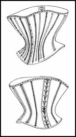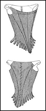 Teilen, zwei pro Hälfte, und wurde in der vorderen oder hinteren Mitte geschnürt. Auch hierbei gab es regionale Vorlieben - die Engländer schnürten nur in der Rückenmitte, die Franzosen hingegen verwendeten beide Möglichkeiten, bevorzugten jedoch die