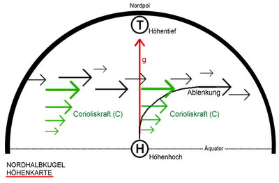 Die oben beschriebene (horizontale) Corioliskraft nimmt vom Äquator zu den Polen hin zu. Am Äquator verschwindet sie. Das nebenstehende Schema veranschaulicht die Ostablenkung der polwärts strömenden Höhenwinde.