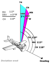Die Deviation (lat. für Abweichung) entspricht dem Winkelunterschied zwischen der Richtung, in die eine fehlerfreie Magnetnadel zeigt, die nur vom Magnetfeld der Erde (MN) beeinflusst ist, und der Richtung, in die sich eine Magnetnadel dreht, die sowohl vom Erdmagnetfeld als auch vom Magnetfeld des Flugzeugs oder des Schiffes beeinflusst wird.