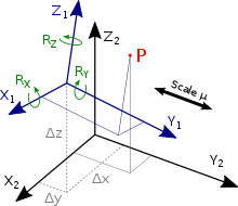… Drehmatrix. Besteht aus drei Drehwinkeln (Drehungen um die Koordinatenachsen) rx, ry, rz. Die Drehmatrix ist eine Orthogonalmatrix.
