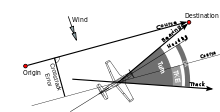Der direkte Weg von einem Ausgangspunkt (origin) zum Ziel (destination) führt über den Kurs. Das ist die Verbindungslinie beider Punkte, - siehe Zeichnung. Bei einer Störung, beispielsweise eine Strömung oder Querwind, wird das Ziel verfehlt. Der zurückgelegte Weg, der Weg über Grund oder Track, weicht vom Kurs ab. Der Schiffs- oder Flugzeugführer steuert gegen. Da der Antrieb mit der Fahrzeugachse (Heading) verbunden ist, dreht er das gesamte Fahrzeug in Richtung der Störung. Wenn es gelingt, den Kursfehler (TKE, Abweichung zwischen geplantem Kurs und Track) auszugleichen, folgt das Fahrzeug seinem ursprünglichen Kurs, aber parallel versetzt um die sogenannte Querablage zum Sollkurs. Da nun TKE Null ist, bestimmt der Driftwinkel die Verkippung des Fahrzeugs aus der Fortbewegungsrichtung.