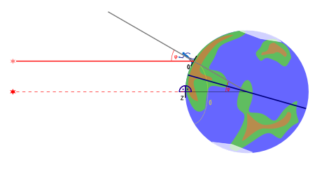 - Die Formel ζ = 90°- h gilt nur für unendlich weit entfernte Objekte. Der dadurch verursachte Fehler heißt Horizontalparallaxe. Sie ist bei der Astronavigation mit Sonne und Fixsternen vernachlässigbar, aber nicht für die Planeten (Korrekturen bis etwa 0,5') und besonders beim Mond (bis zu 1°02').
