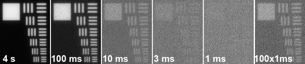 Speziell bei fluoreszenzmikroskopischen Anwendungen kann das Problem auftreten, dass die erzeugte Fluoreszenz sehr lichtschwach ist und daher eine gewisse Belichtungszeit nicht unterschritten werden darf, um genügend Photonen zu sammeln, um den erforderlichen Mindestkontrast beziehungsweise ein ausreichendes Signal-Rausch-Verhältnis zu erzielen. In der Hellfeldmikroskopie ist dies auf Grund der verwendeten relativ hohen Lichtintensitäten in der Regel kein Problem; das Phänomen lässt sich jedoch künstlich nachstellen, indem die Belichtungsstärke stark abgesenkt wird (siehe Abbildung).