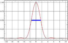Die Auflösung nach dem Rayleigh-Kriterium lässt sich zwar berechnen, aber experimentell nur schwer bestimmen: Zwei sehr kleine Objekte müssten immer näher zusammengeschoben werden, bis sie nicht mehr unterscheidbar wären. Aus praktischen Gründen behilft man sich in der Fluoreszenzmikroskopie daher mit der Halbwertsbreite (engl.: full width half maximum, FWHM) der Punktspreizfunktion (engl. point spread function, PSF). Die Punktspreizfunktion beschreibt das durch Beugung zu Stande kommende dreidimensionale Abbild eines fluoreszenten Punktes, sie ist eine Funktion des optischen Systems, im Wesentlichen des Objektivs. Sie kann ebenfalls berechnet werden. Für die experimentelle Bestimmung werden fluoreszierende Objekte eingesetzt, deren Größe unter der Auflösungsgrenze liegt, beispielsweise 150 Nanometer kleine, mit Fluoreszenzfarbstoff getränkte Latexkügelchen oder Quantenpunkte. Gemessen wird die Halbwertsbreite der Intensitätskurve in Nanometern oder Mikrometern (siehe Abbildung). Auflösung und Halbwertsbreite der PSF stehen in einer mathematischen Beziehung zueinander, die PSF-Halbwertsbreite liegt bei etwas kleineren Werten als die Auflösung.