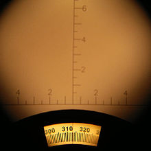 Die sogenannten Absehen haben häufig Striche oder ein Fadennetz in Strichteilung (~6283 ≙ 2π*1000 Striche sind 360°). Die Entfernung berechnet man wie folgt: