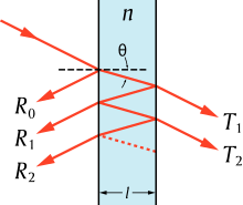 Tritt ein „Lichtstrahl“ in das Bauteil, so wird der Lichtstrahl gemäß den Fresnel-Formeln an jeder (optischen) Grenzfläche teilweise transmittiert (T1, T2, …) und reflektiert (R0, R1, R2, …). Es findet eine Aufspaltung der auf die Oberfläche treffenden Strahlen statt. Die transmittierten, gebrochenen Strahlen werden wiederum teilweise an der Unterseite der Schicht reflektiert und treffen wiederum auf die Oberfläche. Bei der dort stattfindenden Reflexion verlässt nach erneuter Brechung ein Teil der Strahlen (R1) die dünne Schicht, der andere Teil wird reflektiert und erfährt im weiteren Verlauf in der Schicht Mehrfachreflexionen. Dies führt zu vielen parallel austretenden Strahlen gleicher Frequenz auf beiden Seiten des Bauteils.